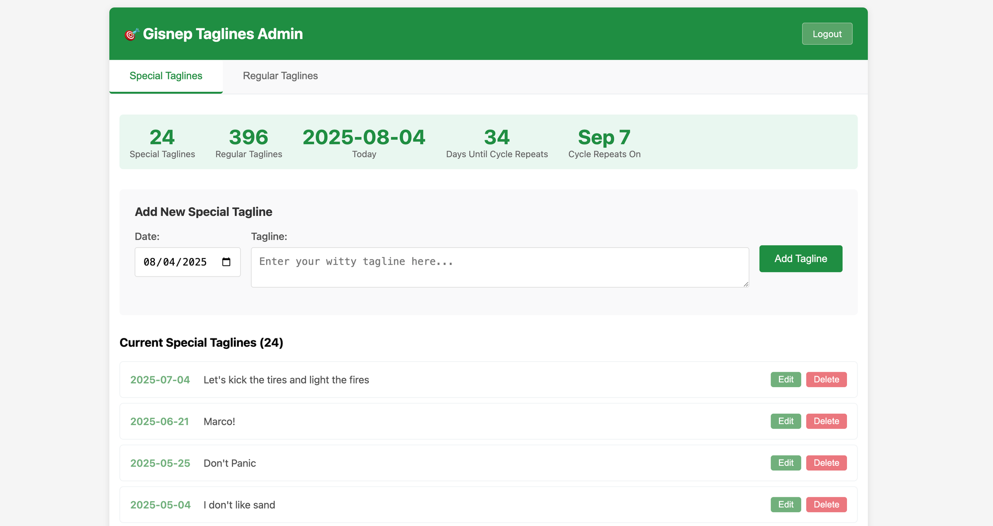 Actually, hang on a second... [vibe-coding]. Okay, I just built a web interface for myself to manage the taglines. It’s hopefully going to be less friction than manually editing a json and uploading it via FTP, and encourage me to write more timely taglines more often. We’ll see.