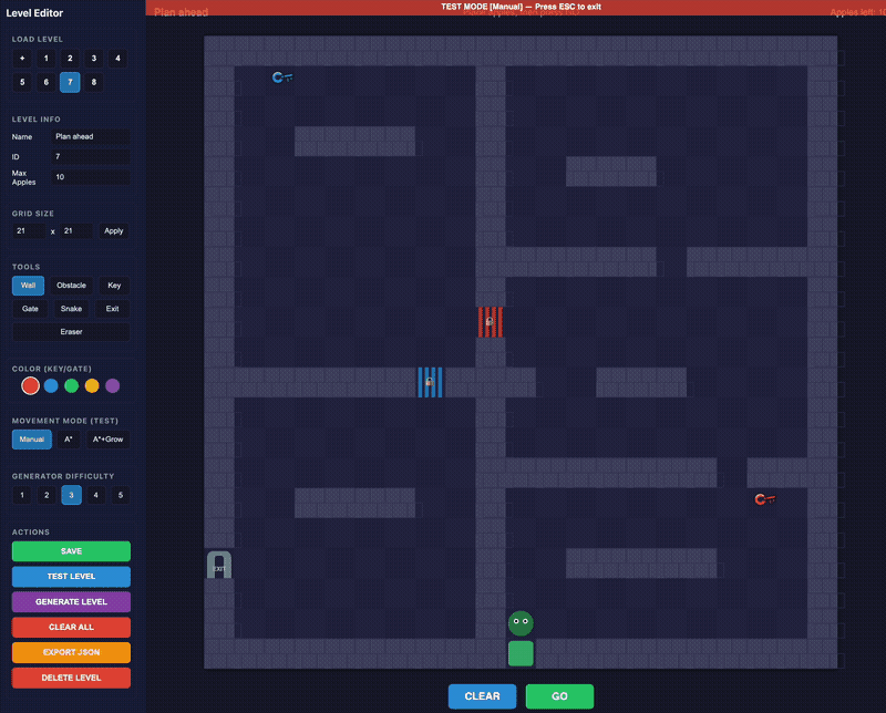 Here’s me testing the game inside the level editor to show you what it looks like. You can watch me set the apples in advance and then the snake goes after them in order, picking up keys that unlock gates so it can get to the exit: