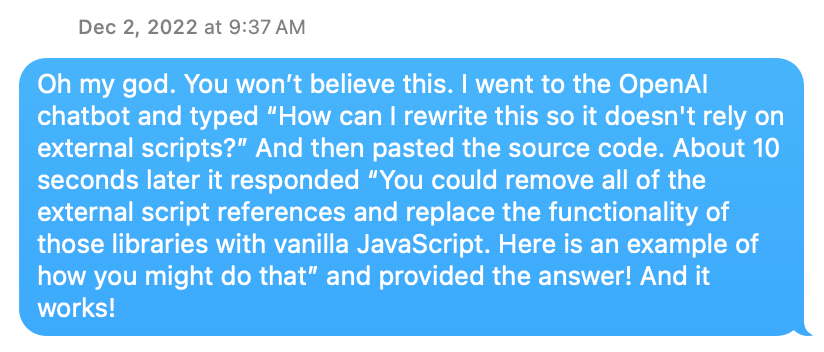 Literally two days after ChatGPT launched, I used it to fix some broken javascript on my website that I didn’t know how to fix myself, and I was amazed. Nobody called it vibe-coding yet, but that’s what it was. And I’ve been vibe-coding all kinds of projects ever since.