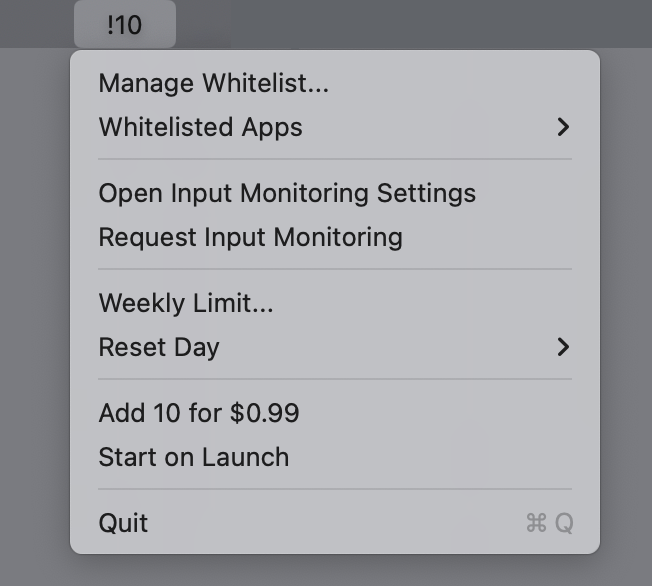 So after all this time, I made it! It lives in the toolbar and every time you use an exclamation point, it alerts you as it decreases your allotment until you’re all out, and then you’re cut off until it resets. But you can whitelist apps that actually need exclamation points, like if you program in a language that uses != to mean “not equal to.”