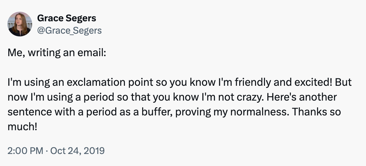 But in the 13 years since I first thought this up, my feelings around exclamation points have changed. Research has shown that women use exclamation points more than men, and the discussion around that is a bit complicated. Women are told to use fewer exclamation points in business communication. But the exclamation point is also seen as communicating a warmth and friendliness, as opposed to a bossy tone.