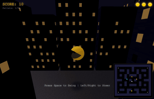 Eventually I came up with a prototype that’s actually fun to play! Pac-Man swings through a city-like maze eating pellets and avoiding ghosts. A more traditional maze map in the corner shows an overview of where everything is.