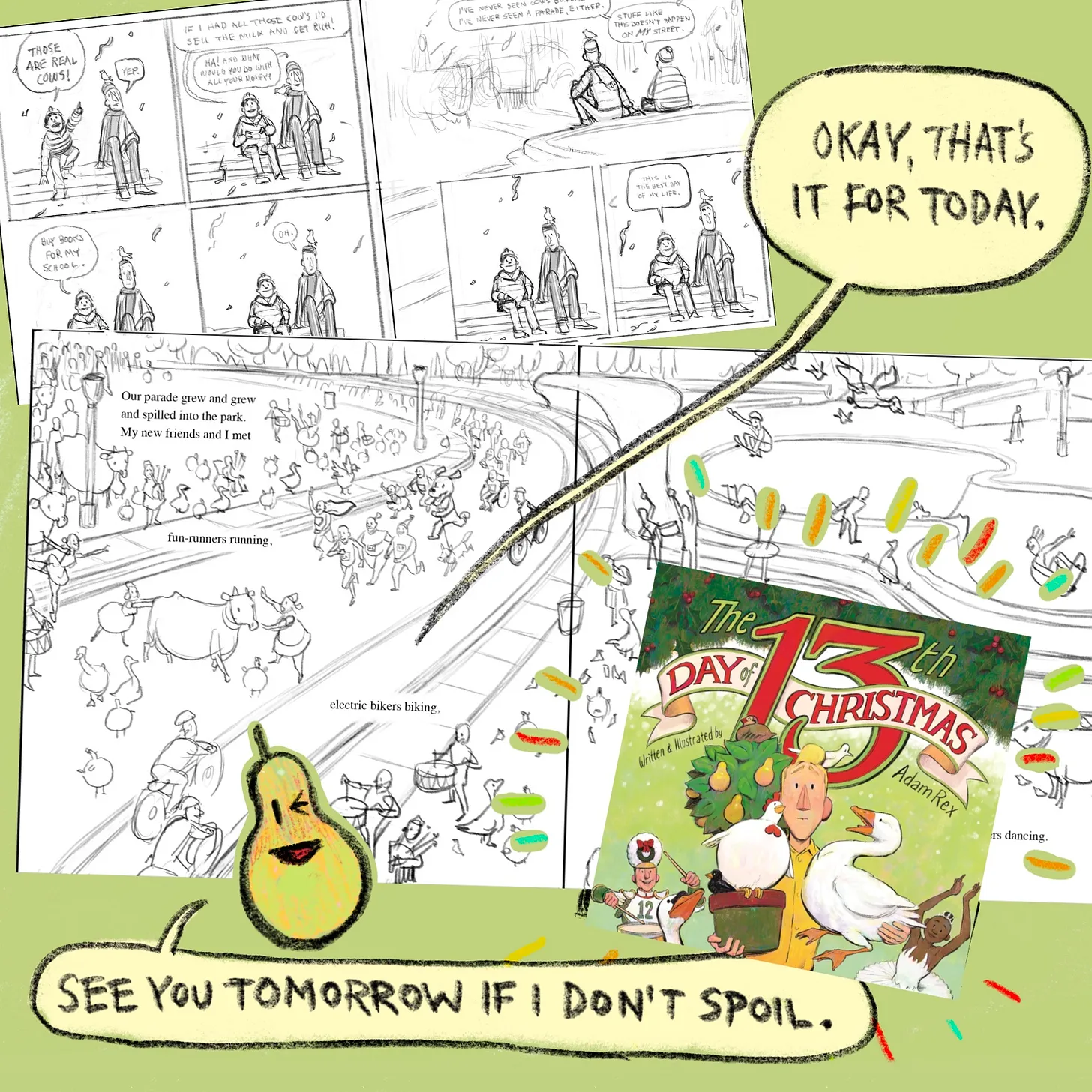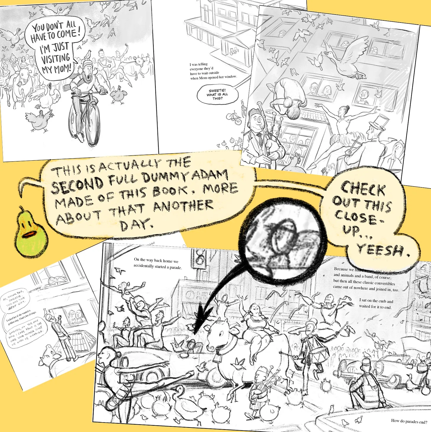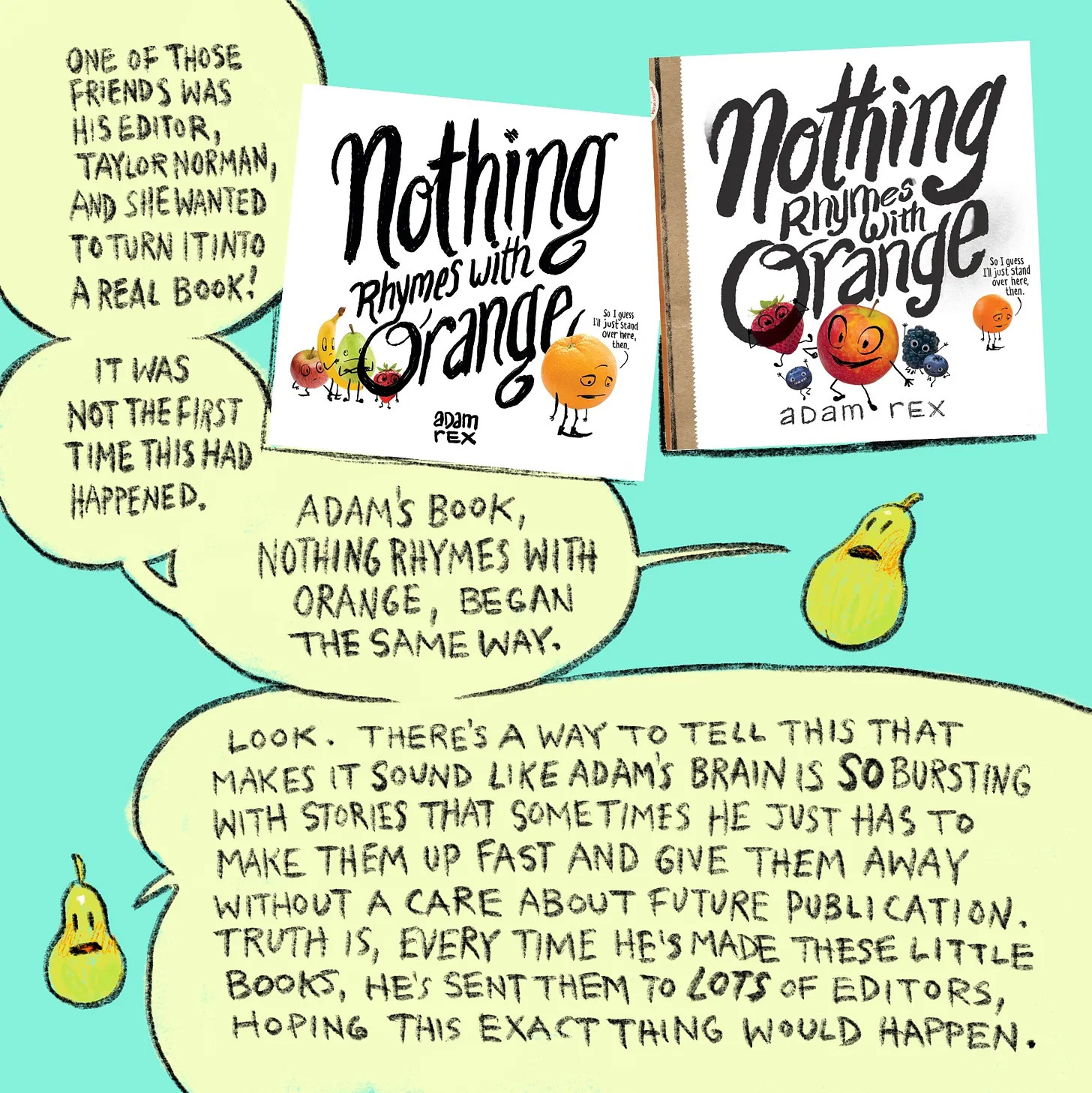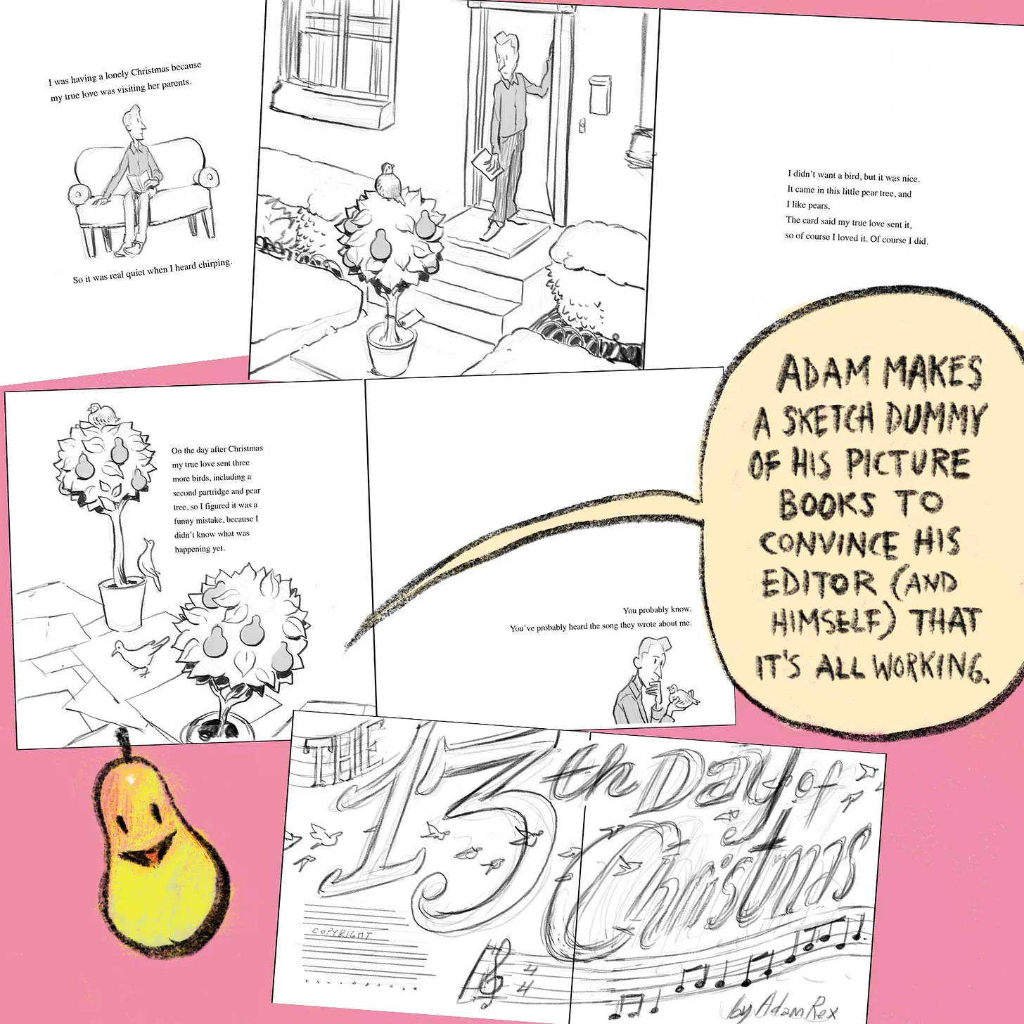 I thought it was a really good promo. It shows a lot of the work that goes into writing a picture book behind the scenes – the character sketches, the cover designs, the legal considerations, etc – all with Adam’s wit and style.