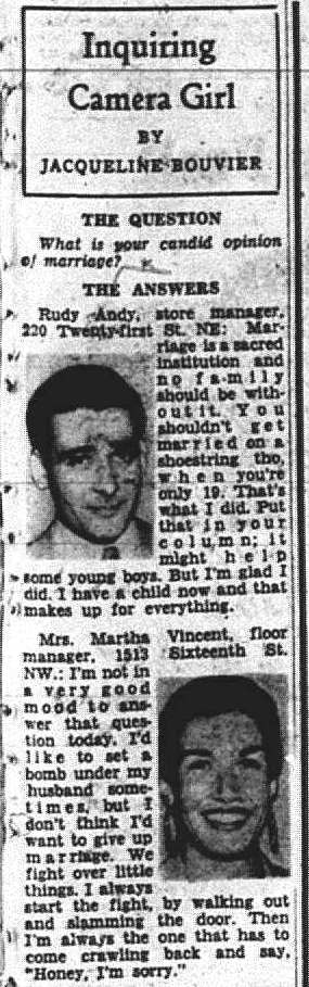 In her role as Inquiring Camera Girl, she published around 600 columns, including one where she asked a question of a young senator named John F. Kennedy: