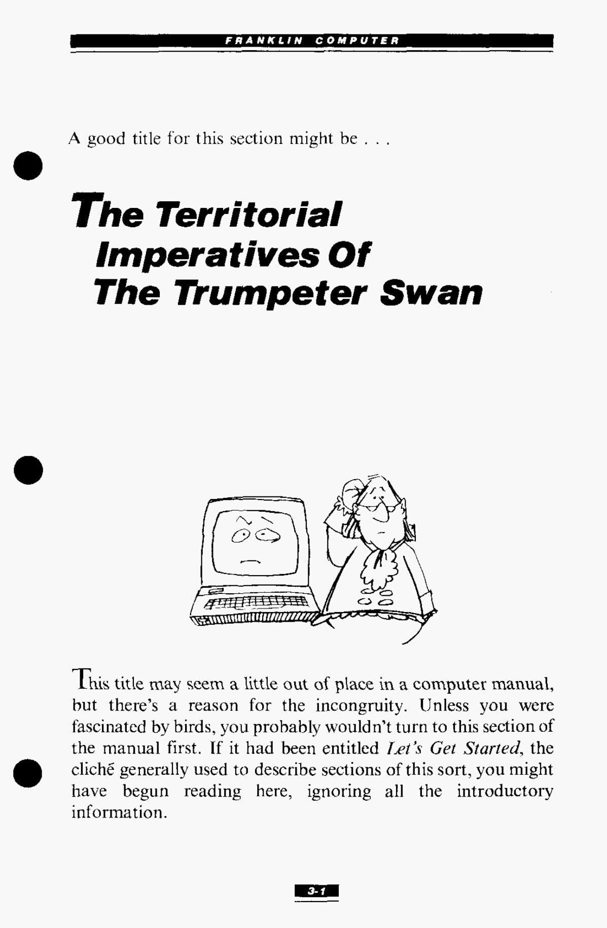 And then, on page 40, there is a chapter called “The Ancestral Territorial Imperatives of the Trumpeter Swan.” That’s a really strange chapter to put in a computer manual. Here’s how the chapter begins: