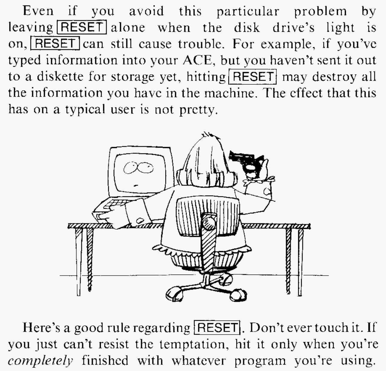 The Ace 1000 manual has a very dark section about the computer’s “reset” button, which was an actual physical button on the machine that they warned you never to press. This is what it says: