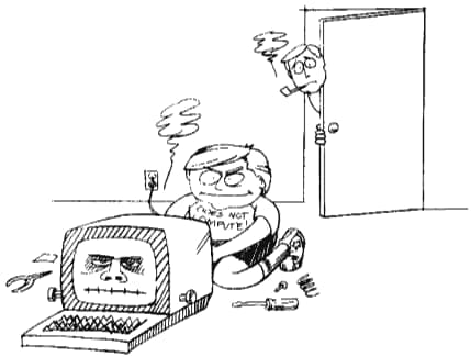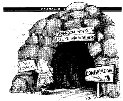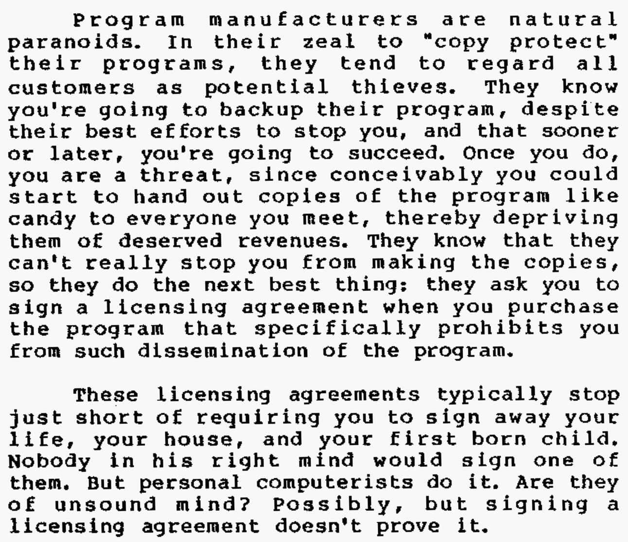 The manual goes on to describe three categories of crooks in the computer world. The first category is “Them,” the computer salespeople who overhype their products with advertising gimmicks. The second category is “You.” Franklin isn’t actually calling you a crook, but they say that software manufacturers will treat you like one with over-reaching licensing agreements: