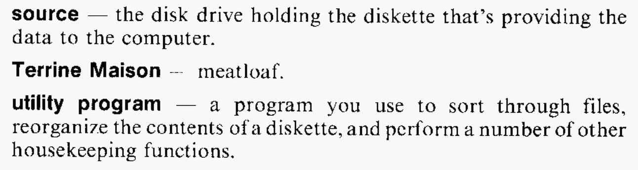 But the Ace 1000 manual isn’t just a watered down version of the Ace 100 manual. It has its own jokes, including several humorous glossary entries. For example, in the first chapter of the manual there is a list of things you can do with a computer. One thing it says you can do is “get a list of recommendations for wines to serve with Terrine Maison.” I have no idea what Terrine Maison is. But you’ll find it helpfully defined in the glossary: