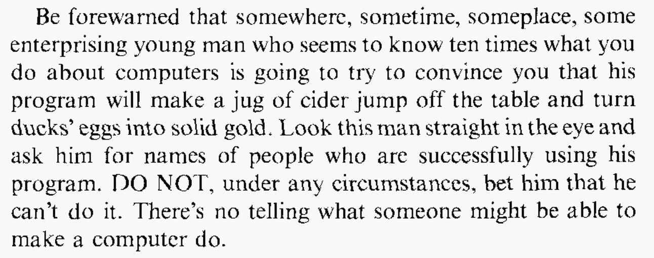 In both manuals, the author tries to explain what kinds of programs are useful and which to stay away from. He states that “the sole purpose of many of these wonders in programming is to separate you from your money.” And then he gives this warning: