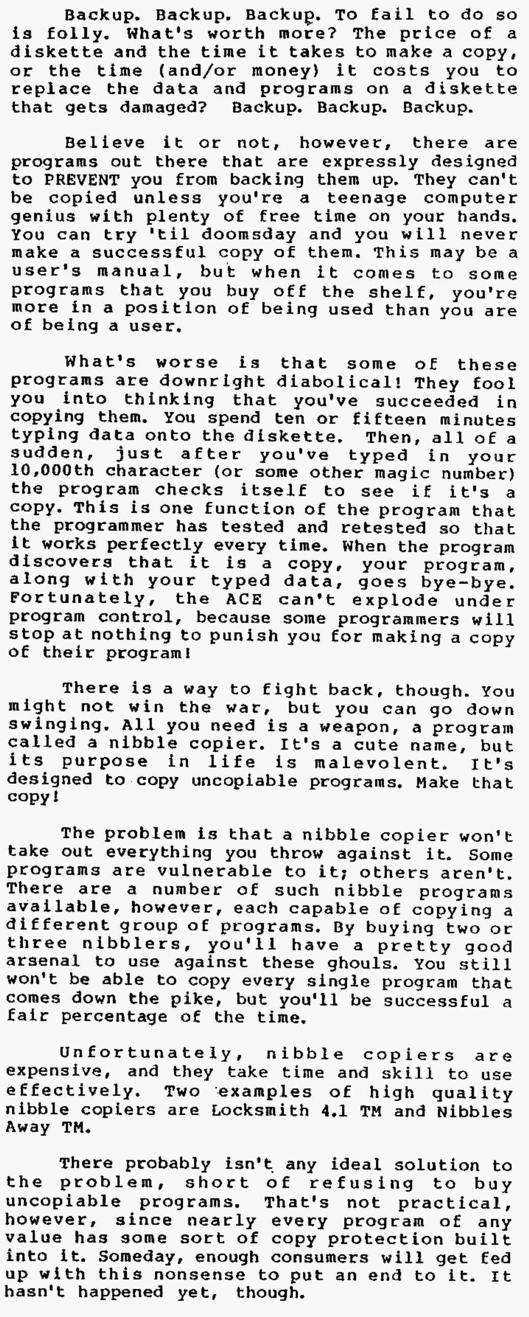 The Ace 100 manual includes one section so shocking that I can’t imagine a modern computer company even considering putting it in a manual. In this section, you are advised to circumvent copy protection to make personal backups of programs you lawfully purchased, and it even recommends software to help you do that!